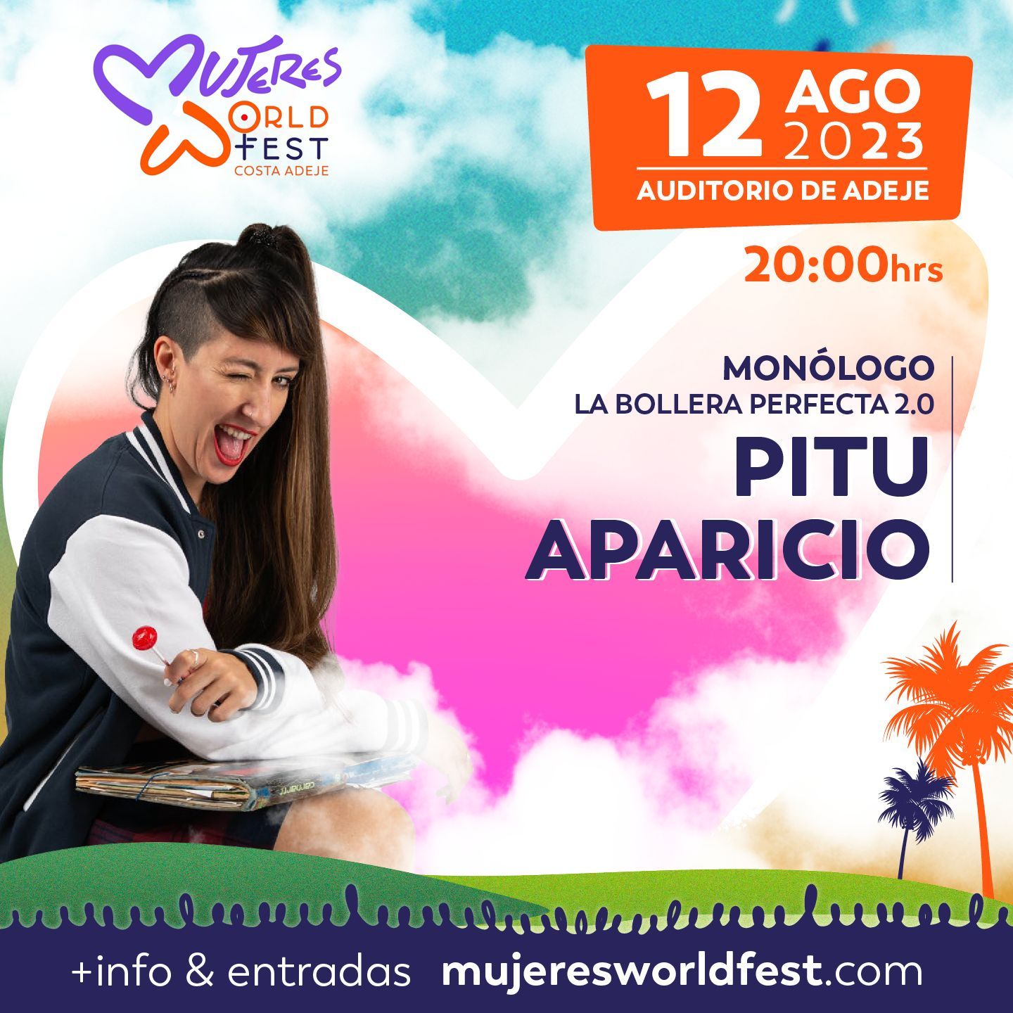 Mujeres World Fest incluye este año a Pitu Aparicio como una de las protagonistas de la programación cultural del festival que se desarrollará en el nuevo y flamante Auditorio de Adeje. En esta edición nos ofrecerá un Taller de Sexualidad, Género y Coeducación el 11 de agosto a las 18:00 horas, y su exitoso monólogo La bollera perfecta, el 12 de agosto a las 20:00 horas, ambas en la Sala Contemporánea del Auditorio de Adeje.